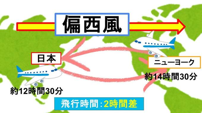 年末年始、旅行などで飛行機を利用する人も多いと思いますが、行きと帰りでフライト時間の違いに大きな差があることに気がついた人も多いのではないでしょうか?成田発ニューヨーク着(東行き)だと飛行時間の目安は約12時間30分~13時間30分。一方、ニューヨーク発成田着(西行き)だと約13時間30分~14時間30分と最大で約2時間も差があるのです。実はこの飛行時間の差に「偏西風」が関係していたのです。
