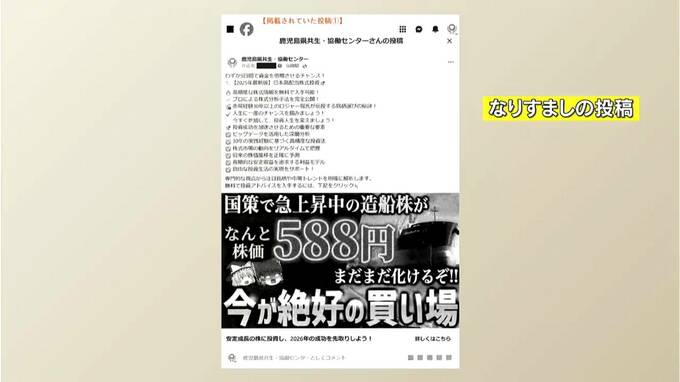 なりすましの投稿では、「国策で急上昇中の造船株が絶好の買い場」など株の投資を呼びかけていて、実在する経済評論家の顔写真を使ったものや、日本語が不自然な投稿もあります。
