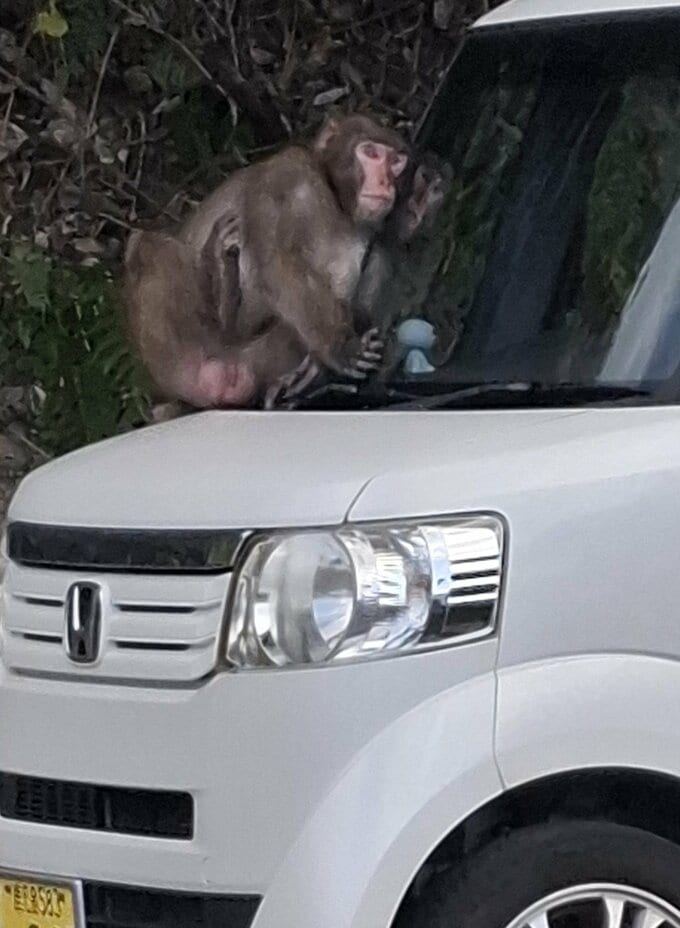 目撃した女性によりますと、「山のほうでバキッと枝を折るような音がして、木の枝が揺れるのが見えた。ボンネットの上にサルを見つけた」「車の中から撮影したが、こっちにきたら怖いと思った」ということです。