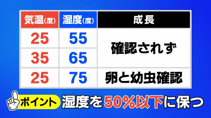 石川県ふれあい昆虫館 渡部晃平学芸員「高温多湿を好むチャタテムシを温度や湿度を変えて成長を観測した実験では、気温25度・湿度55%や気温35度・湿度65%では成長が確認されませんでした。しかし、気温25度・湿度75%では卵と幼虫が確認されたことから、湿度の高い場所を好むことが分かります。」