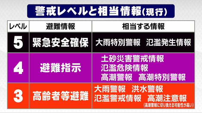 それから、避難情報に対応する防災気象情報の覚えにくさも課題となっていました。気象庁が発表する防災気象情報はそれぞれ、自治体が発表するいずれかの避難情報に「相当する」と紐づけられているのですが、この「相当する」という概念が重要なので、避難情報とその警戒レベルとともに丁寧におさらいしておきましょう。2019年に導入された大雨5段階警戒レベルでは、危険度が低い順から、レベル1が早期注意情報(警報級の可能性)、レベル2が注意報、レベル3が高齢者等避難、レベル4が避難指示、レベル5が緊急安全確保と定められています。