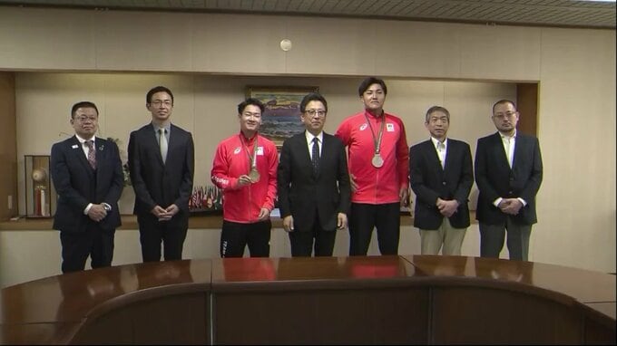 熊本市役所を訪れたのは、陸上4×100mリレーで金メダルに輝いた熊本学園大学の冨永幸佑選手と、サッカー男子で日本デフ史上初の銀メダルを獲得した中尾悠人選手です。