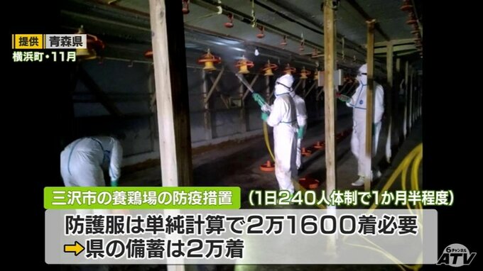 作業にあたっている県の職員は全員、真っ白な防護服を2枚重ねて着用しています。今回の青森県三沢市の養鶏場の防疫措置完了までは、1日あたり240人体制で1か月半程度かかった場合、必要となるのは、単純計算で2万1600着で、県が現在備蓄している2万着を上回ります。県は、不足しないよう随時、調達していくとしています。