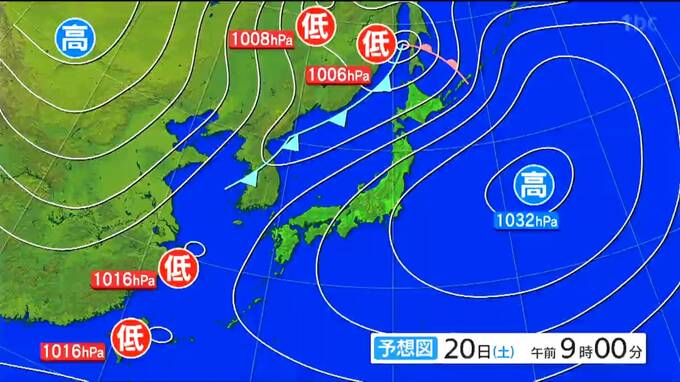 20日午前9時の予想天気図です。東北地方は、移動性の高気圧に覆われるでしょう。前線に向かって暖かな空気が流れ込む見込みです。