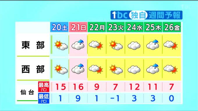 日曜は前線の影響で雨が降るでしょう。来週は曇りや晴れの日が多いですが、木曜は前線や低気圧の影響で雨が降る見込みです。最高気温は平年より高い日が多いですが、変化が大きくなるため、体調の管理に注意してください。