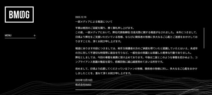 SKY-HIさんについては、一部メディアで深夜に未成年と自宅で面会したなどの報道がなされており、自身の会社「BMSG」の公式サイトで文章を掲載しています。そこでは「この度、一部メディアにおいて、弊社代表取締役 日髙光啓に関する報道がなされました」「本件につきまして、日頃より弊社をご支援いただいている皆様、ならびに関係者の皆様に多大なるご心配とご迷惑をおかけしておりますことを、深くお詫び申し上げます」と謝罪しています。