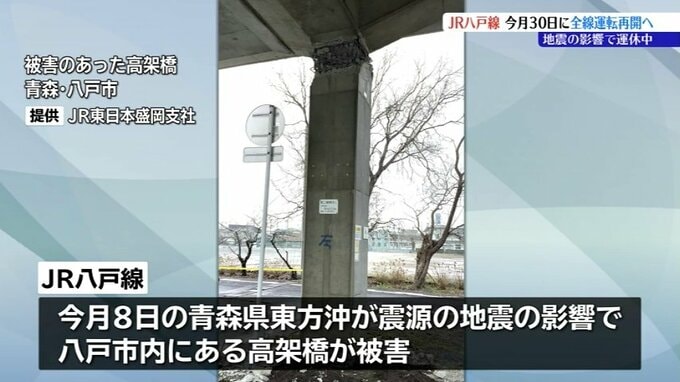 JR東日本盛岡支社は、青森県東方沖を震源とする地震の影響で運休している八戸線について、30日に全区間で運転再開を目指すと発表しました。