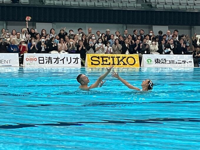 チームでは藤丸真世さん(2004年アテネ五輪 チーム銀メダル)らと一緒に「マンマ・ミーア」を、混合デュエットでは男子ASの第一人者・安部篤史さん(2019年世界水泳選手権 混合デュエット銅メダル)と「オペラ座の怪人」を演じ、集まった約150人の観客を魅了した。