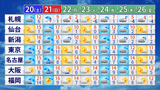 20日の予想最高気温は、那覇24℃、福岡21℃、大阪19℃、名古屋15℃、東京13℃、新潟16℃、仙台15℃、札幌12℃です。