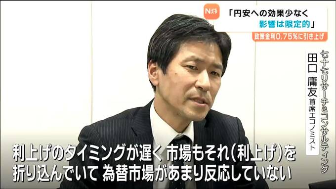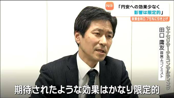 今回の利上げの背景の一つには、円安とそれに伴う物価高がありましたが、市場は利上げを織り込み済みで直後の円相場は1ドル=156円前後と円安水準は変わりませんでした。宮城県内経済に詳しい専門家は、期待された円安の修正がなく「影響は限定的」と指摘しています。