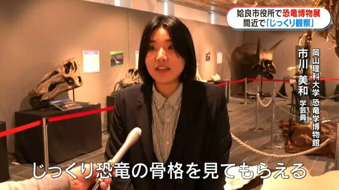 (岡山理科大学恐竜学博物館 市川美和 学芸員)「普通の博物館の展示よりも、かなり標本との距離が近い。じっくり恐竜の骨格を見てもらえる」