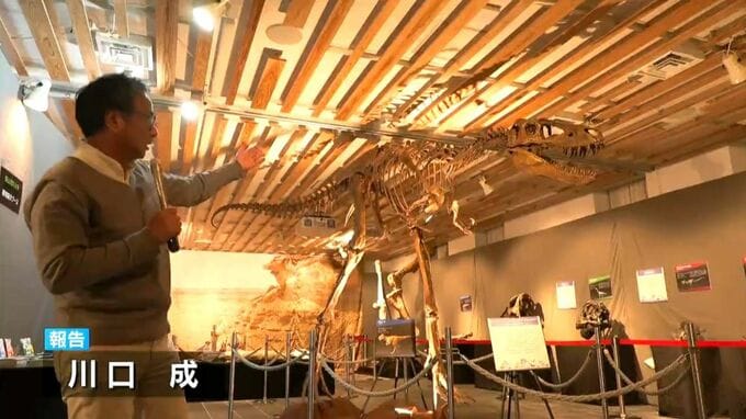 (記者)「高さおよそ2.5m、全長およそ6.5mの実物大のティラノサウルスの仲間の骨格標本です。展示されているのは、姶良市役所の一角です」