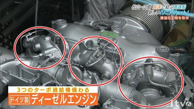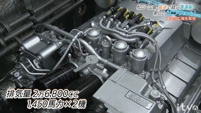 3つのターボ過給機が備わるドイツ製のディーゼルエンジンで、排気量は2万6800CC、出力はおよそ1450馬力、これが2機乗せられます。