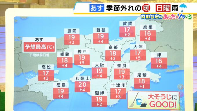 12月20日(土)の近畿地方は、季節はずれの暖かさ。日中は晴れ間もあり、大掃除がはかどりそうです。 日本の東にある高気圧の縁をまわって、南から湿った空気が流れ込むでしょう。このため、南部を中心に朝ま…