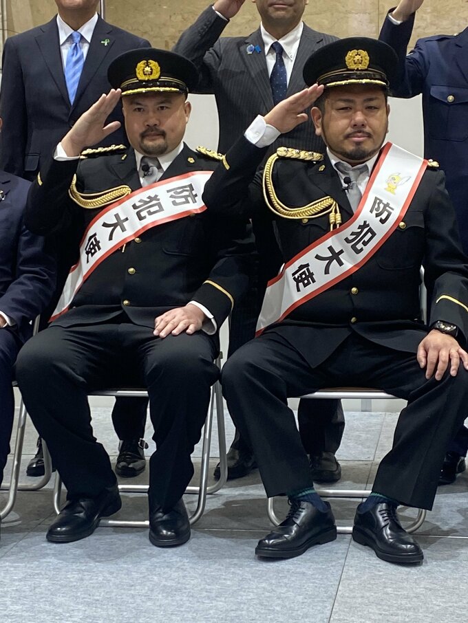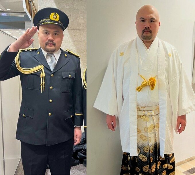 お笑いコンビ・鬼越トマホークの良ちゃんは、「昨日は一日署長で今日は一日組長。」と綴りました。その写真は、警察官の衣装を着たものの隣に、白地の羽二重と黒地に金の模様があしらわれた紋付き袴姿のもの。後者はあたかも、やくざ映画などに出てくる "組長” のようないでたちです。
