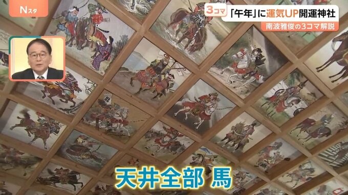 金運にご利益があるといわれる由縁は建物の中にあります。古くから「財運」の象徴といわれる「馬の絵」100枚で、天井が「馬だらけ」になっています。