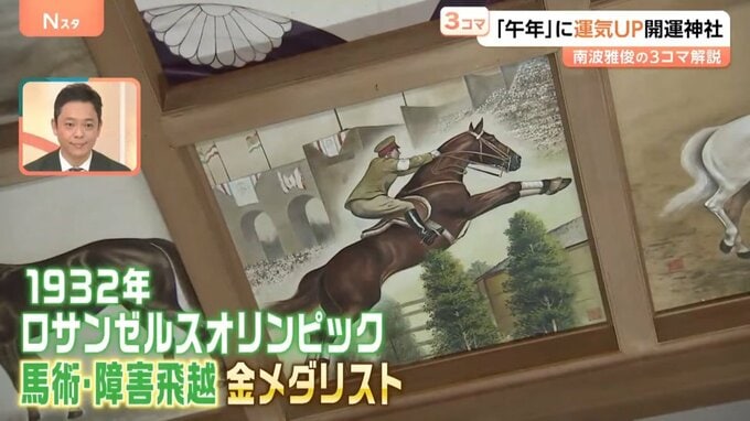 神社ソムリエ・佐々木さんによると、特に金運UPに繋がりそうな絵は、1932年のロサンゼルスオリンピックの馬術・障害飛越で金メダルを獲得した日本人選手の絵だということです。「金」メダルということで、金運も上がるとされているそうです。