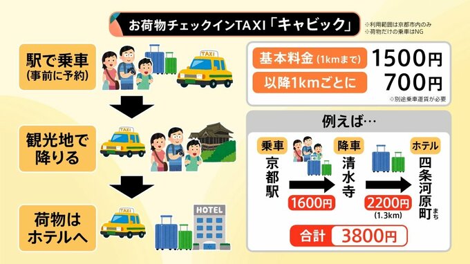 京都市内で利用できる「お荷物チェックインTAXI『キャビック』」は、事前に予約したタクシーに駅で乗車し、観光地で降りると、荷物だけをホテルに運んでくれるというサービスです。