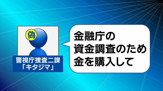 男らに誘導され、LINEの利用登録をした女性は「キタジマ」からLINEのビデオ通話で「金融庁の資金調査のため貴金属販売店から金を購入して」と言われ女性は時価9800万円相当の金塊5.6キロを市内で購入。「キタジマ」の指示通り自宅前の歩道に置いたところ何者かに持ち去られたということです。