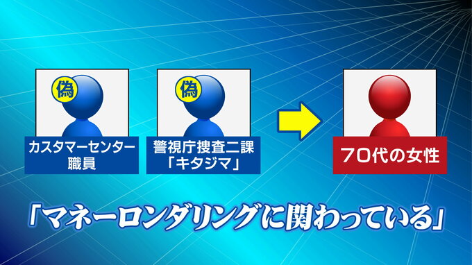 警察によりますと今年8月12日、女性の自宅の電話にNTTカスタマーセンターの職員や警視庁捜査2課の「キタジマ」という警察官を騙った男から電話があり女性は、「あなたがマネーロンダリング事件に関わっている疑いがある」などと言われました。