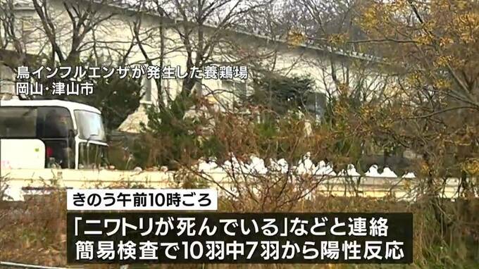 岡山県によりますと、きのう(19日)朝、採卵用のニワトリを飼育する津山市の養鶏場から「ニワトリが死んでいる」などと連絡があり、簡易検査をしたところ、10羽中、7羽から陽性反応が出ました。