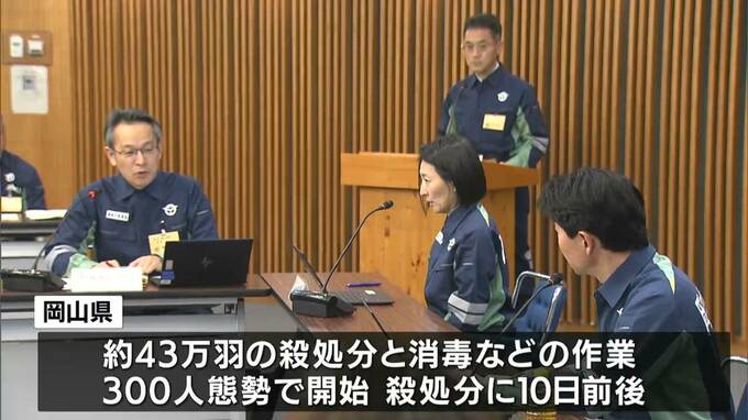 およそ43万羽の殺処分と消毒などの作業を始めました。作業は300人態勢で始まっていて、殺処分には10日前後かかる見通しです。