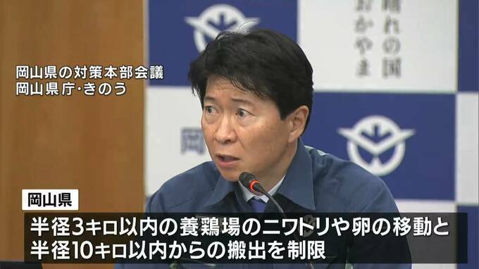 岡山県では、この養鶏場から半径3キロ以内の養鶏場のニワトリや卵の移動と、半径10キロ以内からの搬出を制限するとともに、