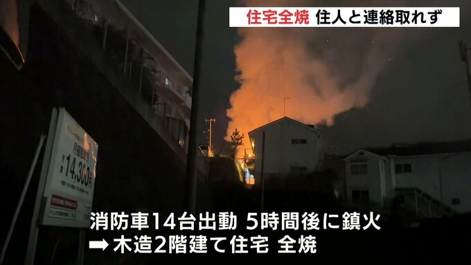 消防車14台が出動し、火は5時間後に消し止められましたが、木造2階建ての住宅が全焼しました。この家で一人暮らしをしている50代の男性と連絡が取れていないということです。
