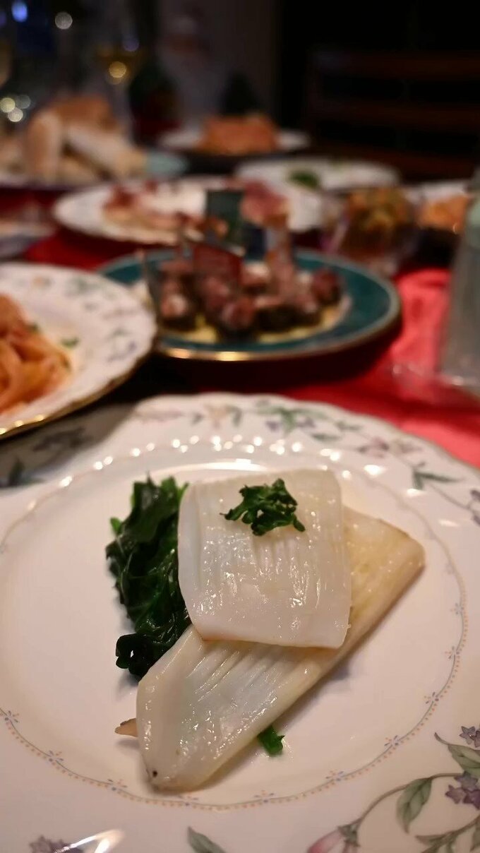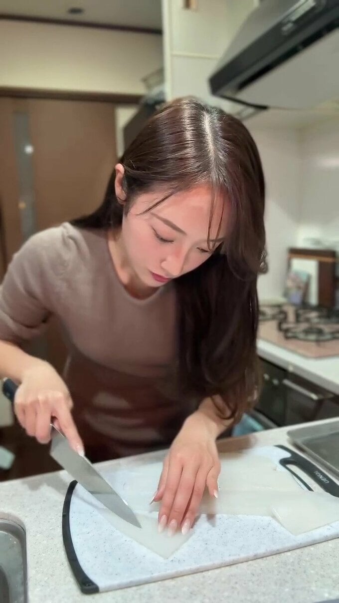 片原さんは、キッチンばさみを使うなどして手際よくアオリイカの胴体を切り開き、薄皮を剥いでいきます。これから作るのは「シンプルなイカのソテー」「(レストランで)美味しすぎたから再現したい」とのことで、切り開いたイカの身に包丁を入れていく手つきは確かで迷いがありません。今回は「親友達」と「ホムパ」クリスマスも近いので「ほぼクリパ」とのこと。