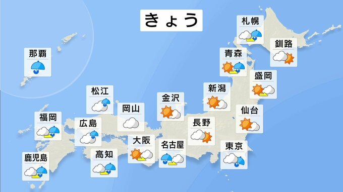 きょうは広い範囲で曇りや雨となるでしょう。昼間は近畿や北陸・東北で晴れ間の出る所がありますが、次第に天気は下り坂となりそうです。すでに雨が降り始めている関東も、夜は本降りとなるでしょう。雨具を持って…