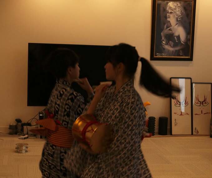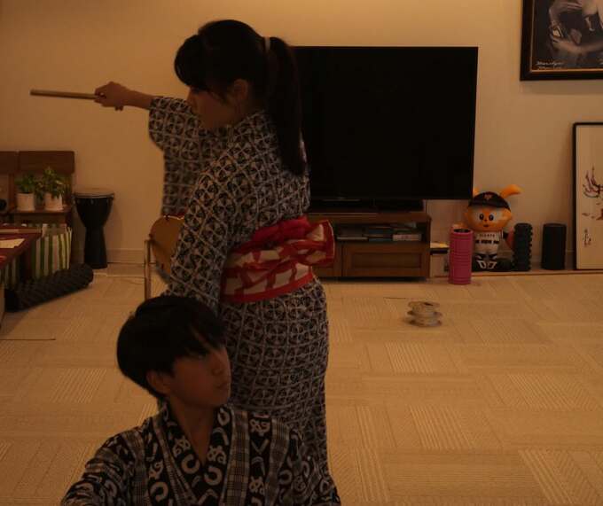 ぼたんさんと新之助さんは、共に着物に帯という稽古用の装束を着て、時には鼓らしき打楽器を抱えながら、動きを合わせています。