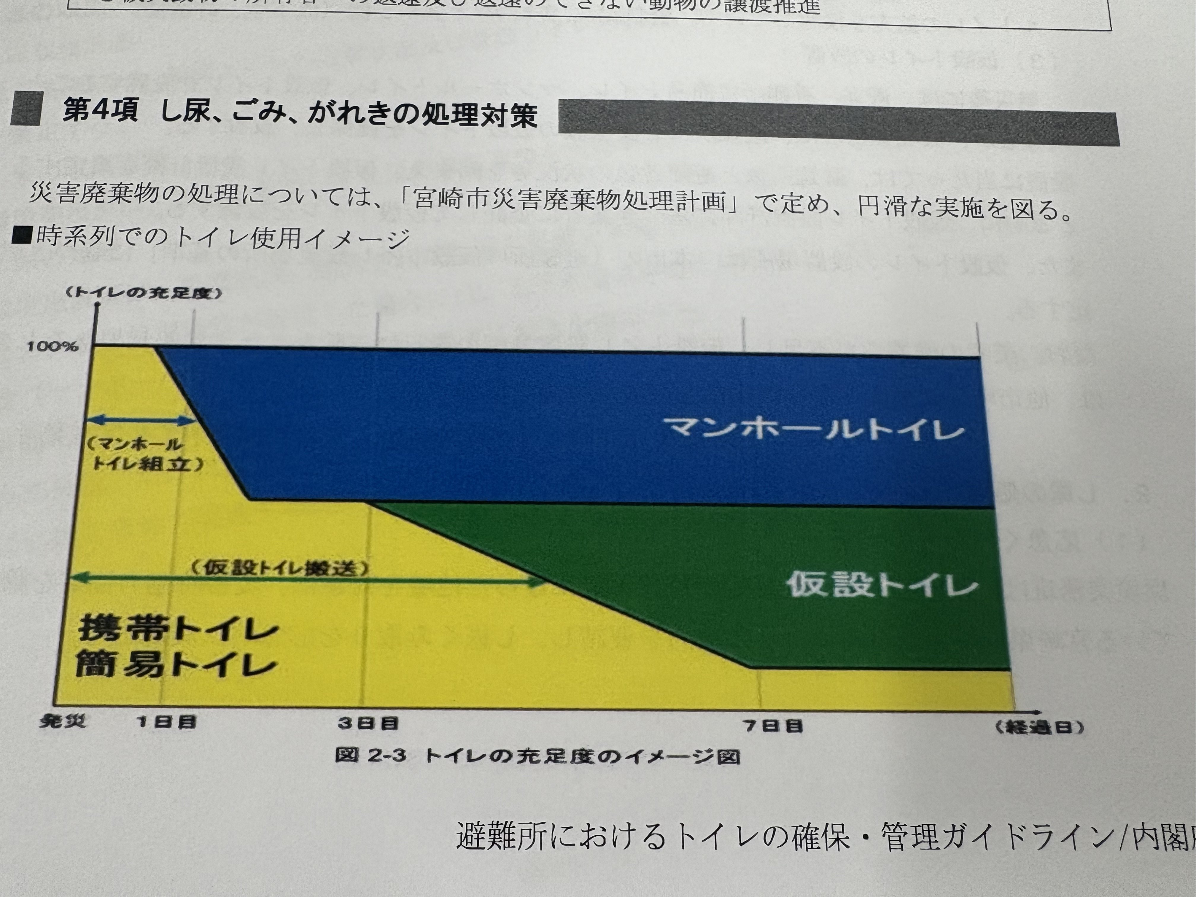 内閣府は「避難所におけるトイレの確保・管理ガイドライン」を定め、各自治体に具体的な計画の立案と準備を求めており、宮崎市でも2025年8月に改定した「地域防災計画」の中で、トイレの問題については、「時系列でのトイレの活用方法」や「仮設トイレの設置基準」を明確化したほか、「住民の責務」としての備蓄に最低3日分の「携帯トイレ」を追加しました。