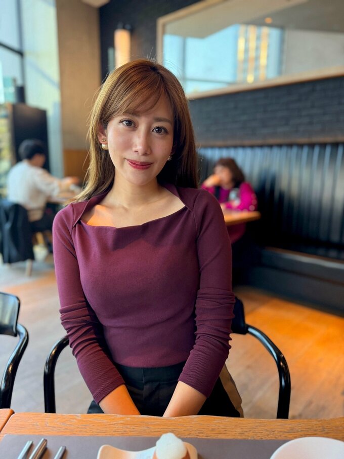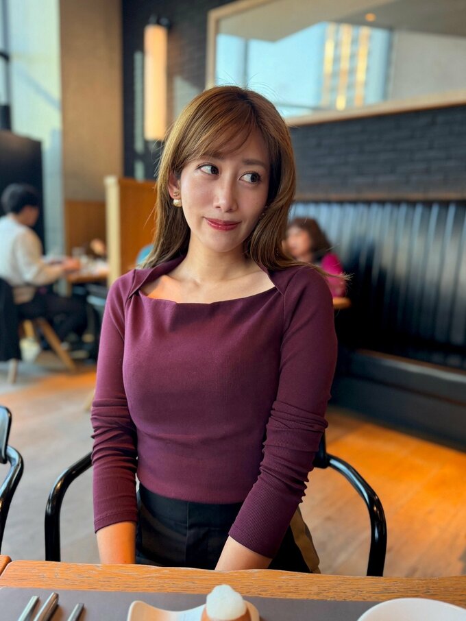 投稿された画像では、木の温もりを感じる床と黒いソファ、シックな内装が特徴的なレストランの席に座る中川さんの姿が。ワインレッドのトップスに黒のボトムスを合わせた上品なコーディネートが目を引きます。
