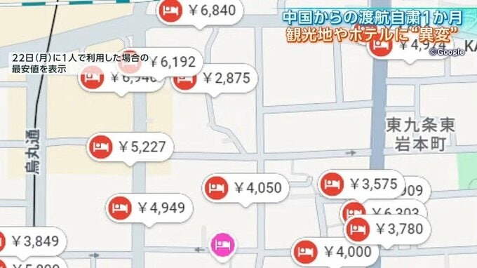例えば京都駅周辺のホテルの22日(月)の宿泊料金を見てみると、1万円以下がずらり。団体客に人気のホテルが、相次ぐキャンセルで値下げしていると見られます。