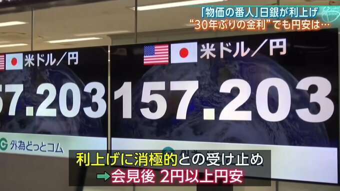 一方、今回、日銀が踏み切ったのは円安の是正が期待される利上げです。市場関係者は、この利上げが、継続的に行われるのかを注目。植田総裁の発言によっては円高に振れる可能性がありましたが...