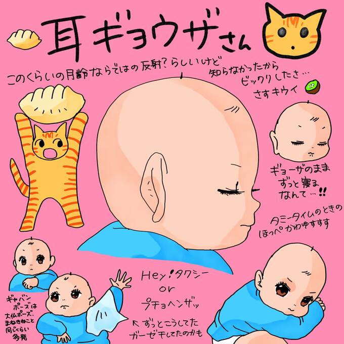 特に注目を集めたのは「耳ギョウザさん」と題した手描きの絵日記。中川さんは「このくらいの月齢ならではの反射?らしいけど知らなかったからビックリした」と綴っています。