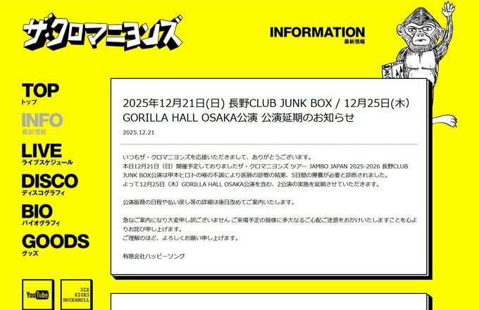」「本日12月21日(日)開催予定しておりましたザ・クロマニヨンズ ツアー JAMBO JAPAN 2025-2026