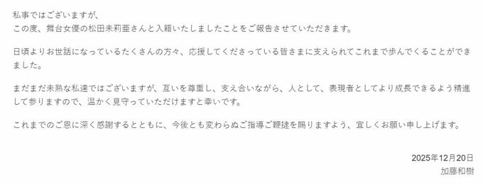 私事ではございますが、この度、舞台女優の松田未莉亜さんと入籍いたしましたことをご報告させていただきます。