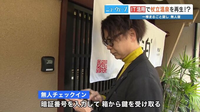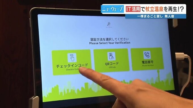 無人旅館ではITシステムを活用。宿泊者はメールで届く暗証番号を入力して玄関の鍵を受け取り、中に入ってタブレット端末でチェックインするだけです。
