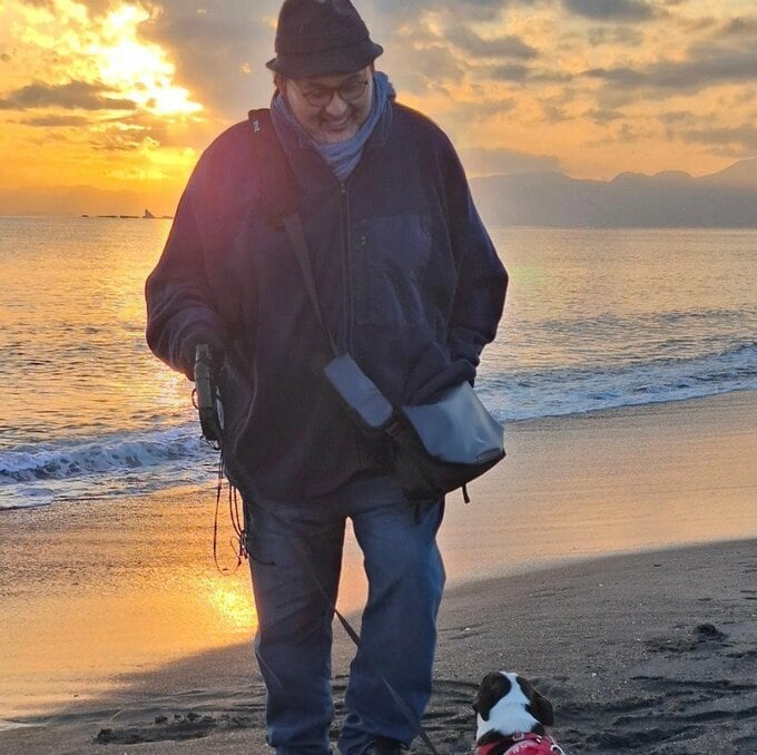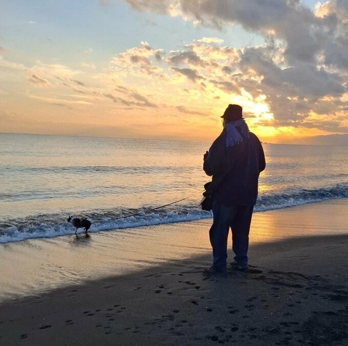 この投稿に、「最高の夕日ですね~!」「波の音が聞こえてくるようです」「素敵な海辺の夕暮れにダンディーな男性がお散歩 素敵ですね」「優しい笑顔がいい 幸せで気持ちに少し余裕ができましたかね」「人生楽しまれているようで何よりです!」などの声が寄せられています。