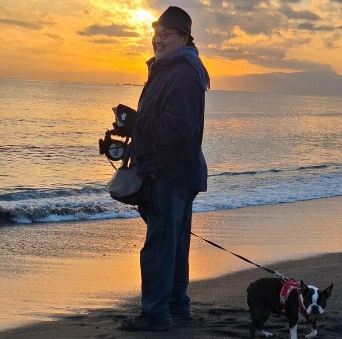 また別の写真では、リードで繋がれた黒と白の小型犬と共に、オレンジ色に染まった空を背景に穏やかな時間を過ごしている様子が伝わってきます。