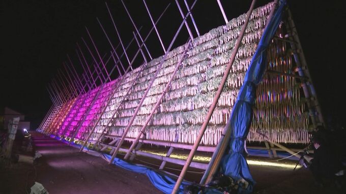 宮崎市田野町の冬の風物詩、大根やぐらを明るく照らすライトアップが始まりました。暗闇に明るく照らされた「大根やぐら」。今年も宮崎市田野町内の2か所でライトアップが始まりました。このうち、田野町体育館近…