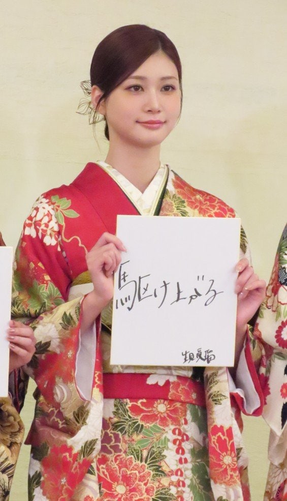 この日、生見さんはゴールドの帯に赤地に大輪の花が印象的な華やかな着物姿で登場。2026年の目標を生見さんは「駆け上がる」と色紙にしたためると、‟年女なので止まることなく、休まず働き続けたいと思います”と決意を語りました。