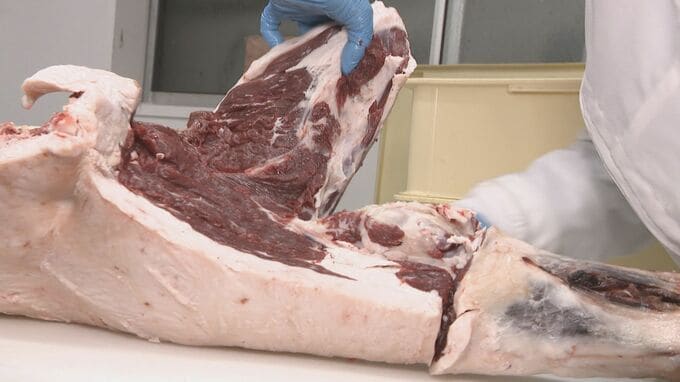 山の麓にあるクマの解体工房にも潜入した。扉を開けると、皮を剥がされたクマが吊るされていた。内臓も取られ、血抜きも済ませ、解体を待つばかりのクマで、体調1メートル、体重は約100キロ。全身の9割は淡いピンク色に染まっていたが、それが脂肪で、冬眠を前にエサを食べ脂が乗った状態になっていた。