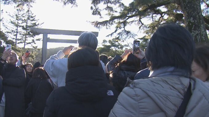 参拝者は防寒対策を徹底しながら、鳥居から昇る朝日を写真に収めました。