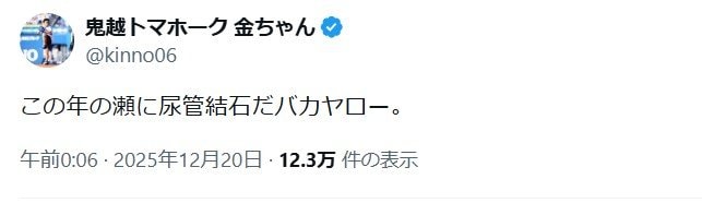 金ちゃんは自身のX(旧Twitter)アカウントで「この年の瀬に尿管結石だバカヤロー。」と投稿。年末の忙しい時期に体調不良となってしまったことに対する苦悩を綴りました。