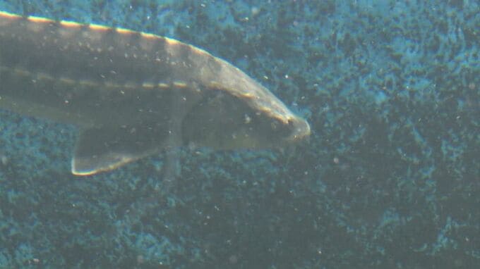 この雑種のチョウザメは、アリゲーターガーやオオクチバス(ブラックバス)など、宍道湖で捕獲された他の外来種と同じ水槽で飼育され、常設展示として見ることができるとのこと。