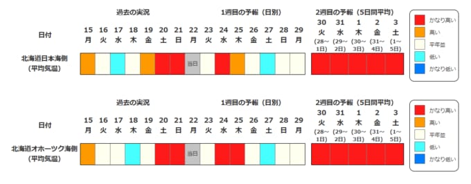 北海道地方の向こう3日間程度は寒気の影響が弱いため高い日が多く、かなり高い日もありますが、12月26日からの3日間程度は平年並か低いでしょう。その後は寒気の影響が弱まるため、かなり高くなる見込みです。