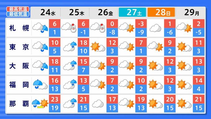 25⽇は、低気圧が⽇本の東へ進み、26⽇(金)にかけては⽇本付近は冬型の気圧配置となる見込みです。