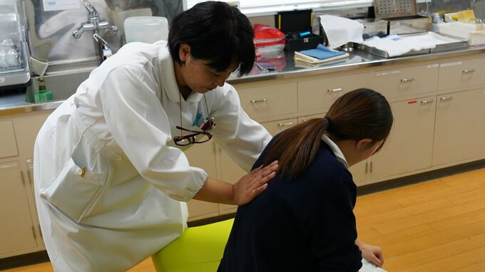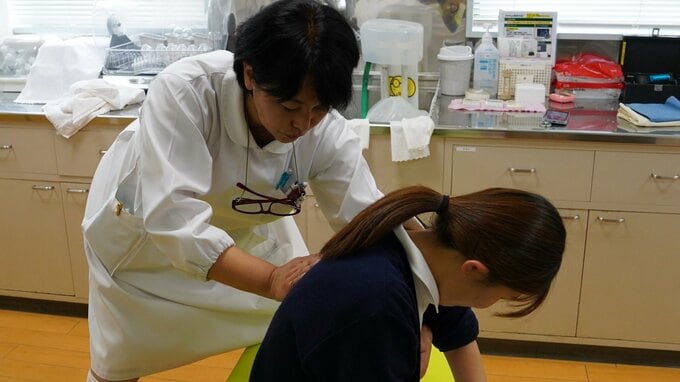 背部叩打法は、ひざまづいて、手の平(手の付け根に近い部分)で、肩甲骨の間を何度も力強く連続して叩く方法です。